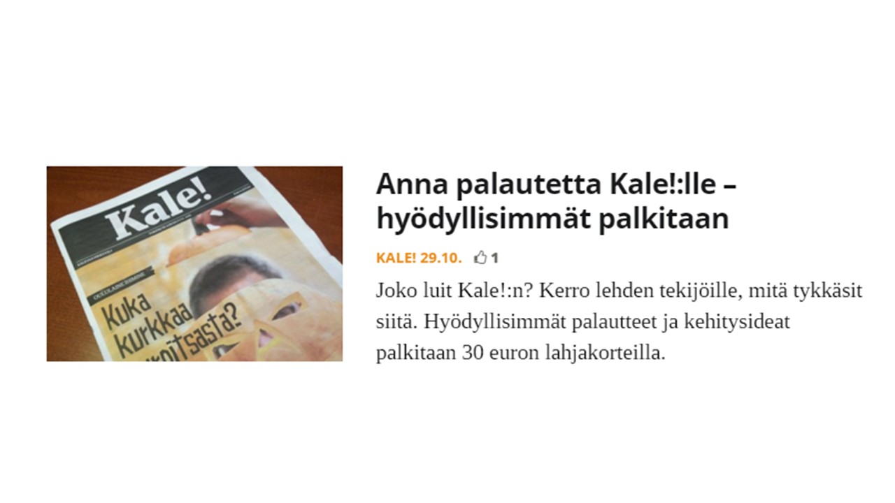 Kalevan kaupunkilehti pyytää palautetta. Täältä pesee: Jättäkää pois huutomerkki ja kaksoispiste Kalen taivutusmuodoista. "Heitä Kalea kielivinkillä" näyttää paremmalta kuin "Heitä Kale!:a juttuvinkillä". Hyvä esimerkki siitä, mihin pulmiin erikoismerkit nimissä johtavat.
