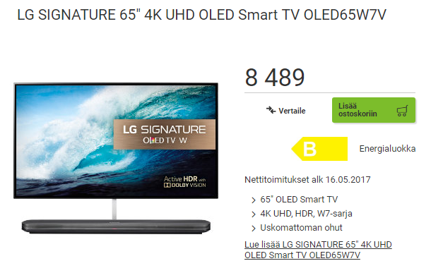 Kaikki muu on lyhennetty paitsi hinta 29.4.2017 Se nyt vaan on tyhmää käyttää pelkkiä lyhenteitä: 65" OLED Smart TV, 4K UHD, HDR, W7-sarja, OLED65W7V. Lisää roskakoriin.